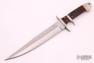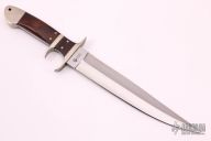 This Sub-Hilt Fighter by Jot Singh Khalsa features a double edged satin finished blade with .246" blade stock and 1.291" blade depth, full tapered tang construction. The handle has nickel silver guard, sub-hilt and rear bolsters, walnut wood scales. Has a little patina on the nickel silver, otherwise excellent condition.