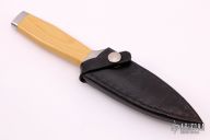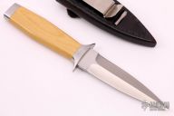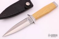 This Dagger by Dale Spendlove features a satin finished double edged blade with .159" blade stock and 1.150" blade depth, hidden tang construction. The handle has a stainless steel guard and butt with yellow paper micarta grip. Comes with a black leather sheath with boot clip. Excellent condition.