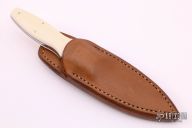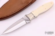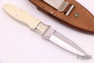 This Boot Dagger by DM Dent features a mirror polished double edged blade, .148" blade thickness and .754" blade depth, full tapered tang construction. The handle has nickel silver bolsters, mammoth ivory scales and black liners. Comes with brown leather sheath with boot clip. Excellent condition.