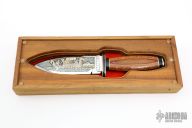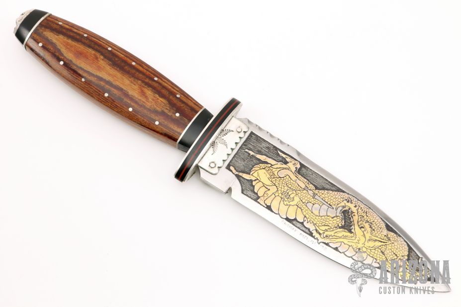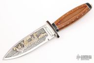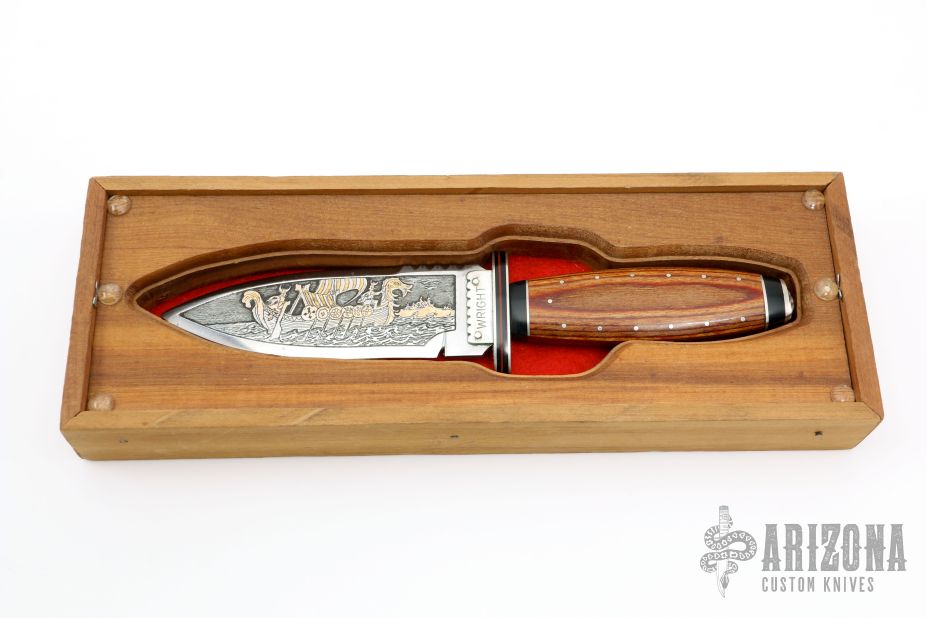 This dagger by Tom Wright features a double edged blade with etched seen of a knight fighting a dragon and a viking ship, fileworked spine, .144" blade stock and 1.497" blade depth, has a fine silver stamped ricasso plate, hidden tang construction. The guard is made of fine silver with red/black spacers, laminated wood grip, carved fine silver butt cap. Comes with a wooden/glass display case. Excellent condition. Dated 1978.