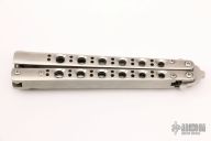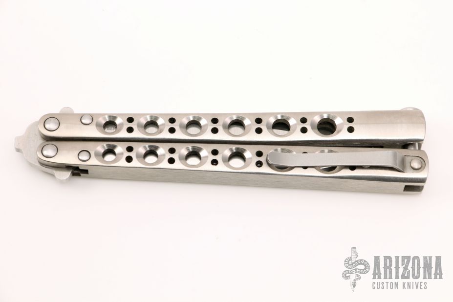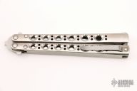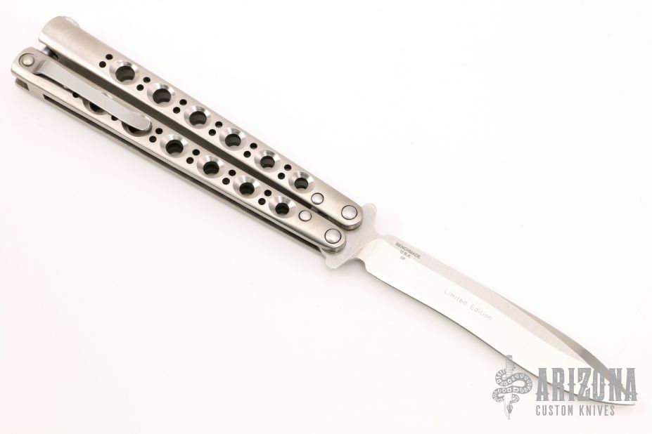 This Model 41MC Bali Song from Benchmade features a recurve drop point blade with swedge. The handle is comprised of titanium scales and steel tip up pocket clip. Latch has a spring to keep the latch open when the blade is deployed. Includes original box.  Excellent Condition.