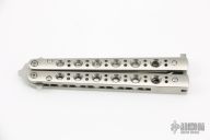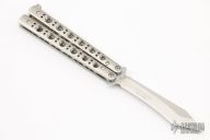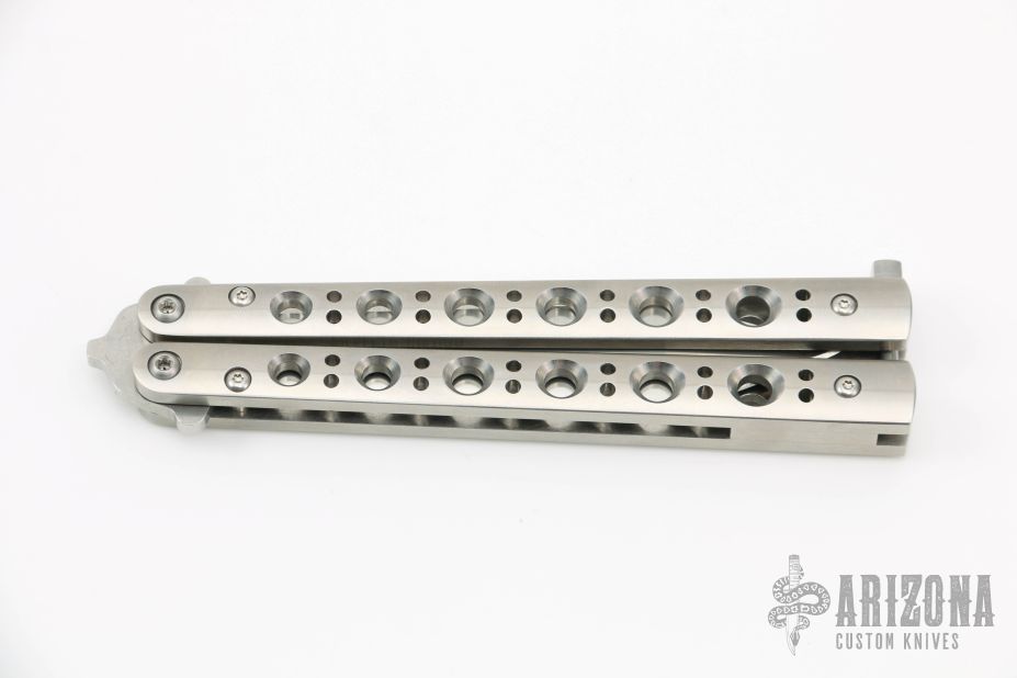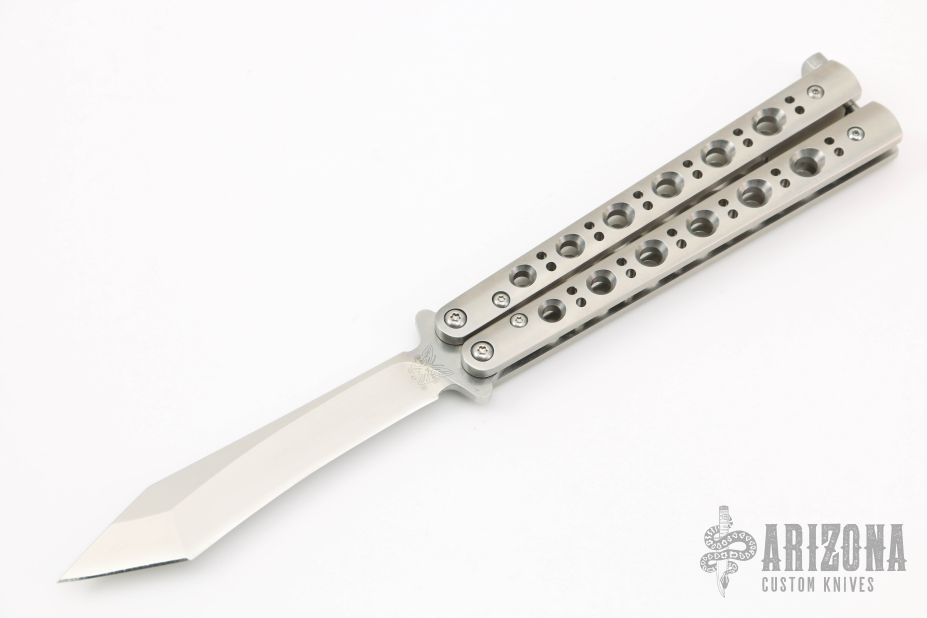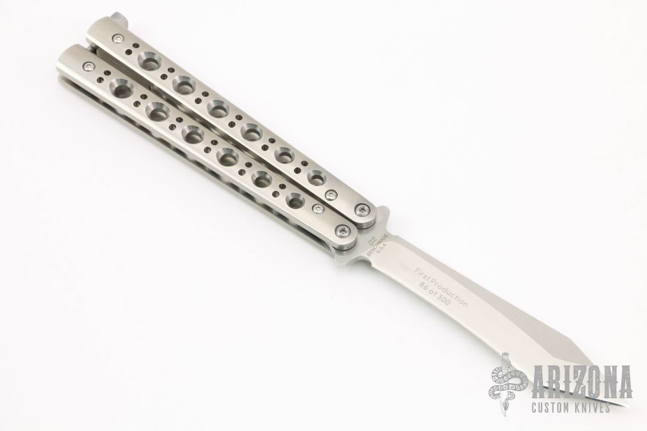 This Model 67 Balisong by Benchmade features a tumble finished tanto recurve blade and stainless handles with T-latch. Nice and tight. Comes with original box, sheath and papers. Excellent condition. First Production Run #86 of 300.