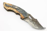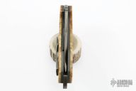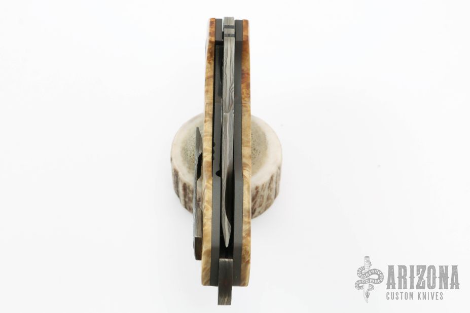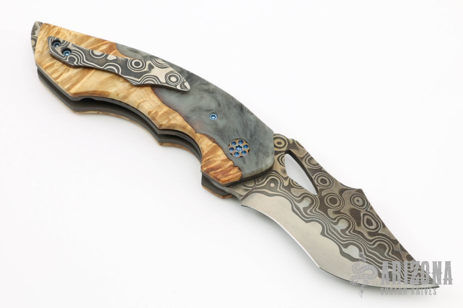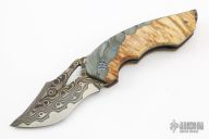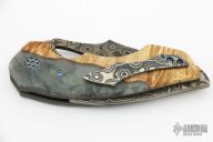 This Predator X by Greg Lightfoot features a Chad Nichols San Mai Damascus recurve blade with asymmetrical swedge and thumbhole. The handle has hybrid wood scales, bead blasted titanium liners, Chad Nichols San Mai Damascus backspacer and tip up clip. Rides on bearings, nice detent and blade seating. Comes with original box and COA dated March 2019. Excellent condition.