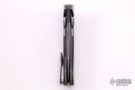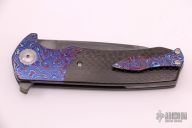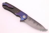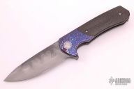 This Typhos flipper by Walter Randolph features a hand rubbed satin finished blade with nice hamon, false top edge, notched thumbrest and flipper. The handle has MokuTi bolsters with Damasteel pivot collars, carbon fiber scales, bead blasted titanium liners, floating Damasteel backspacer, and a MokuTi tip up clip. Nice detent, lockup and blade seating. Rides on bearings. Excellent condition. Comes with a zippered case.