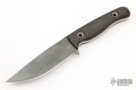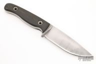 This Knife by Jeremy Horton features a tumbled chisel ground blade with .216" blade stock and 1.239" blade depth, full tang construction. The handle has carbon fiber scales with flanged tub pins. Excellent condition.
