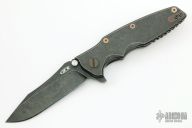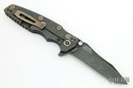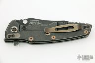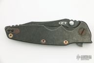 This Limited Edition Hinderer by Zero Tolerance features a black stonewash finished blade with notched thumbrest, dual thumbstuds and notched flipper. The handle has a black stonewash finished titanium frame with  bronze anodized titanium hardware that can be interchanged with any Hinderer hardware. 3-way reversible clip, bronze anodized titanium. Comes with original box and COA. #0239. Has been resharpened, otherwise excellent condition.