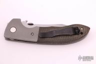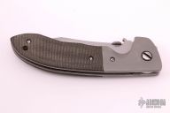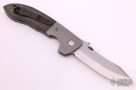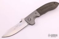 This Custom CQC-8 Folder from Emerson features a stonewash finished blade with bead blast dovetailed titanium bolsters, green canvas micarta scales, bead blast titanium liners, tip up stainless steel clip. Thumb Disc, wave feature, notched thumbrest. Nice detent, lockup and blade seating. Comes with original box and papers. Comes with original G-10 scales. Has some scuffs, has been resharpened, otherwise good condition.