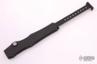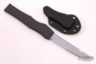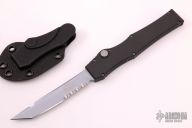 This HALO III is the tanto blade model in the HALO series by Microtech Knives. Single action, side positioned button for firing. Closure via a reverse charging handle in the rear of the frame. Contoured frame grip with milled ribbing on the frame spine and belly. This Halo III has a black tanto partially serrated blade. Dated 11/99 and S/N 1235. Comes with original sheath. Has some light scuffs, otherwise excellent condition.