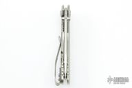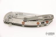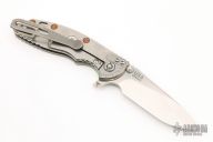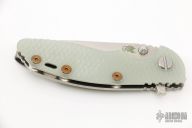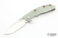 This XM-18 by Rick Hinderer features a stonewash finished slicer blade with notched thumbrest and flipper. The handle has a stonewash finished titanium frame, jade G-10 scale, Comes with brown G-10, orange G-10 and black G-10 scale also, satin titanium barrel spacers, and a tip up or down reversible deep carry titanium clip and filler tab, comes with original clip also, lanyard hole at the butt. Excellent condition. Comes with original box and extra hardware.