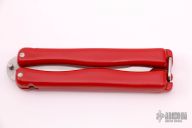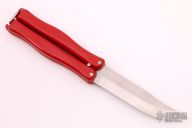 This Vintage CIA Balisong by Hackman has a satin finished stainless steel clip point blade. Handle is red polymer with O-latch at butt. Has some light scuffs and scratches, good condition.