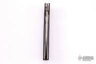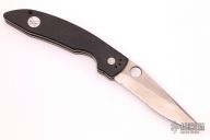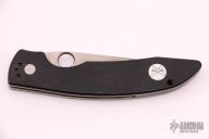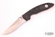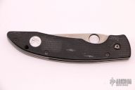 This AFCK liner lock folder from Benchmade has a spear point blade with partial serrations, thumbhole and a notched thumbrest. Handle is black G10 over titanium liners, black backspacer, lanyard hole. Has scratches, has been resharpened, missing the clip, has gouges in the G-10, poor condition. Discontinued.