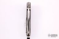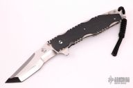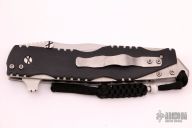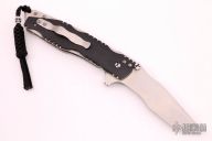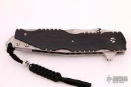 This Linerlock Flipper by Mike Franklin features a satin finished chisel ground blade with notched thumbrest, flipper and dual thumbstuds. The handle has carbon fiber scales, fileworked and jeweled titanium liners, stainless steel backspacer with lanyard hole, tip up jeweled titanium clip. Nice detent, and lock and blade seating. Has some light scratches, otherwise excellent condition.