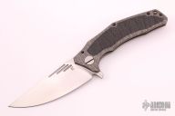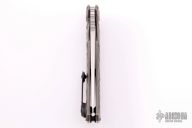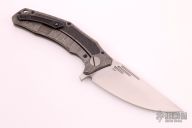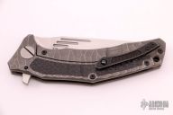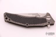 This Morrf-5 by Custom Knife Factory features an upswept hand rub satin finished blade with notched thumbrest and flipper. The handle has a stonewashed machined titanium frame with carbon fiber insets and with matching tip up clip, lanyard hole and black barrel spacers. Nice detent, lockup and blade seating. #194. Comes with nylon zippered case and COA. Excellent condition.