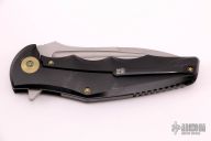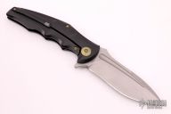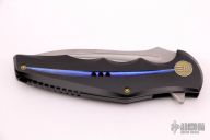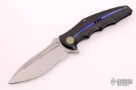 The WE Knife Co. 608H is a reliable flipper made with premium materials and lightweight, ergonomic construction. Its drop point style blade features jimping on the thumb ramp and flipper for added grip and control. The 608H boasts a ceramic ball bearing pivot for unbelievably responsive flipping action. This model has a black titanium handle with a blue accent and bronzed hardware. It is equipped with a stonewash finished blade.