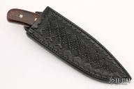 This knife by Master Smith Shane Taylor features a mosaic San Mai Damascus blade with fileworked spine and integral dovetailed bolsters, full tang construction. The handle has desert ironwood burl scales with mosaic pins. Comes with a hand tooled black leather sheath and a zippered case. Excellent condition.