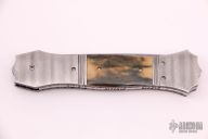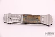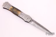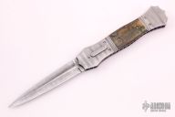 This custom automatic by Jim and Joyce Minnick features a Damascus blade with false top edge. The handle has matching Damascus bolsters, front and rear, matching push button with a diamond set in a gold bezel, mammoth ivory scales, fileworked and anodized titanium liners, fileworked stainless steel backspacer. Strong leaf-spring opening. Nice action, blade seating and lockup. Beautiful materials. Outstanding work with great attention to detail. The makers mark is set in the backspacer. Excellent condition. Comes with a zippered case.