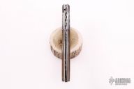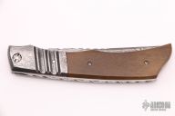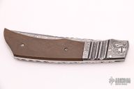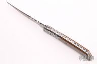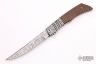 This Bolster Release Automatic by William McHenry features a Damascus blade with fileworked spine. The handle has dovetailed and fluted Damascus bolsters, dark mammoth ivory scales, polished stainless steel liners, fileworked stainless steel backspacer, fileworked interior of backspacer, blued spring. Fast leaf-spring opening. Beautiful materials. Outstanding work with great attention to detail. Numbered 107, on interior. Excellent condition. Comes with a zippered case.