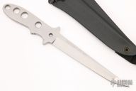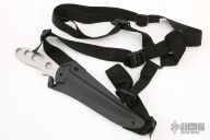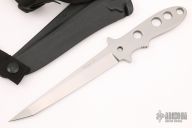 This Vorpal 2-C by Tom Maringer features a bead blast finished tanto blade with notched thumb and finger rests, full tang construction, .243" Blade Stock, .945" Blade Depth. Includes a kydex sheath with shoulder harness. Excellent condition.
