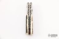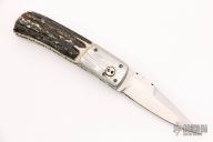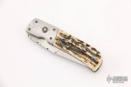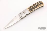 This linerlock auto from Bill King features a hand rub satin finished blade with false top edge and fileworked spine. The handle has dovetailed Damascus bolsters, opal inlaid push button, stag scales over fileworked titanium liners and a brown canvas micarta backspacer. Nice action, lockup and blade seating. Excellent condition. Dated 6-95. Comes with a hard shell case.