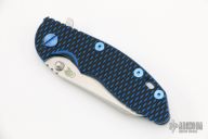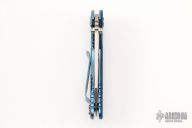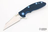 This XM-18 by Rick Hinderer features a stonewash finished blade with notched thumbrest and flipper. The handle has an anodized and stonewash finished titanium frame, blue/black G-10 scale, anodized titanium barrel spacers, hardware, and a tip up or down reversible titanium clip and filler tab, lanyard hole at the butt. Excellent condition. Comes with original box and papers and original hardware.