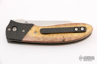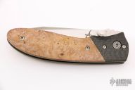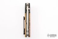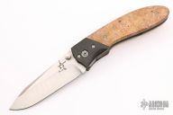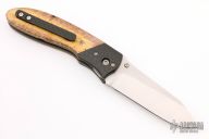This LCC linerlock folder by Greg Lightfoot features a satin finish blade with single thumbstud and notched thumbrest. The handle has carbon fiber bolsters, curly maple scales, blasted titanium liners and posts. Carbon fiber backspacer. Comes with a zippered case and box. Nice detent, lockup and blade seating. This is the Model that inspired the collaboration between Microtech and Greg Lightfoot. Has some light scuffs otherwise excellent condition.