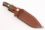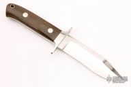 This chute knife by John Young features a mirror polished blade with a sharpened top edge, .214" blade thickness and 1.047" blade depth, full tapered tang. The handle has a stainless steel guard with green canvas micarta scales and red liners. Outstanding fit and finish. Knife is in excellent condition and shows no signs of use/handling. Comes with a brown leather sheath. John said this design was based on Harry Archer's original idea.