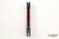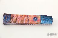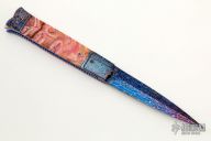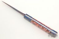 This side opening auto by Rainy Vallotton features a spear point blued Damascus blade with a false top edge. The handle has matching blued Damascus bolsters, front and rear, mammoth tooth scales with red liners, anodized and fileworked titanium liners, and a stainless steel fileworked backspacer. Comes with original box. Has a little spotting on the rear bolsters, otherwise excellent condition.