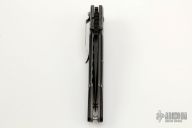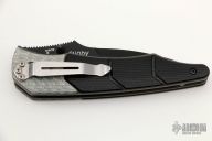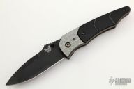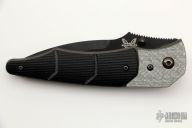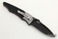 This Snody Design Gravitator folder from Benchmade features a black spear point blade with dual thumb-studs and a notched thumb-rest. The handle has silver twill bolsters and black G-10 scales, with bead blasted titanium liners and stainless steel posts. Has a stonewashed stainless steel clip. Perfect detent, lockup and blade seating. Excellent Condition.