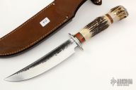 This Hunter by Jim Behring features a satin finished and hammer marked hollow ground blade with a false top edge, .182" blade thickness and 1.23" blade depth, hidden tang construction. The handle has a nickel silver guard and butt, vintage sambar stag grip, black/red/yellow spacer pattern. Great look and feel. Comes with brown leather sheath with premium giraffe hide panel. New from maker.