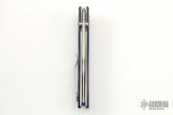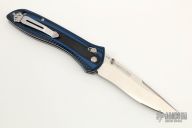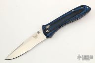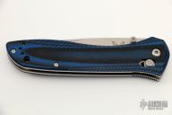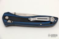 This Benchmade 710-1401 features a stonewash finished drop point blade with "710-1401 Limited" on the blade. The handle is blue/black milled G10 with the axis locking mechanism and reversible deep carry clip positioned for tip up carry. Nice action, detent and blade seating. Comes with original box and papers. Has some light scratches and has been resharpened, otherwise good condition.
