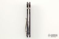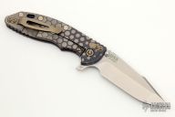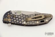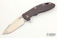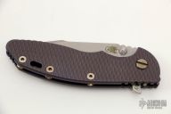 This Skinny XM-18 3.5" flipper by Rick Hinderer features a stonewash blade with notched thumbrest and flipper. The handle has an upgraded anodized titanium front scale and honeycomb pattern titanium frame, a tip up or down reversible titanium clip and filler tab, lanyard hole at the butt. Excellent condition. Comes with original box and extra hardware. Comes with two extra G-10 scales and an anodized titanium liner.