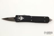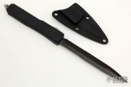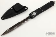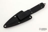 This Venomtech by Microtech knives features a double-edged black finished blade with partially serrated edges. The handle is black aluminum with blasted hardware and glass breaker. Comes with kydex neck sheath. Dated 2014 and serial number 0846. Excellent condition.