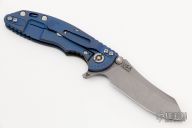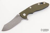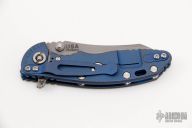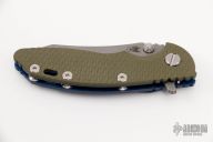 This XM-18 by Rick Hinderer features a stonewash finished blade with notched thumbrest and flipper. The handle has a green G-10 front scale, stonewashed and blue anodized titanium frame, satin hardware, and a tip up or down reversible anodized titanium clip and filler tab, lanyard hole at the butt. Excellent condition. Comes with extra pivot hardware.