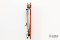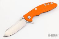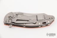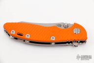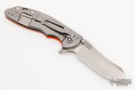 This XM-18 by Rick Hinderer features a stonewash finished blade with notched thumbrest and flipper. The handle has an orange G-10 front scale, stonewashed titanium frame, satin hardware, and a tip up or down reversible anodized titanium clip and filler tab, lanyard hole at the butt. Excellent condition. Comes with extra pivot hardware.