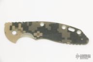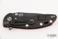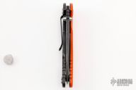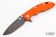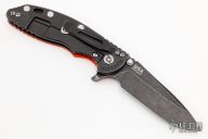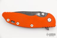 This XM-18 Flipper by Rick Hinderer Knives features a 3.5" battle black finished blade, notched thumbrest and flipper, dual thumbstuds. The handle has a orange G-10 scale, and black titanium handle/clip. Clip can be mounted for tip up or down carry. Nice lockup, seating, and detent. Comes with original box and extra hardware. Extra digicam G10 scale included. Excellent condition.