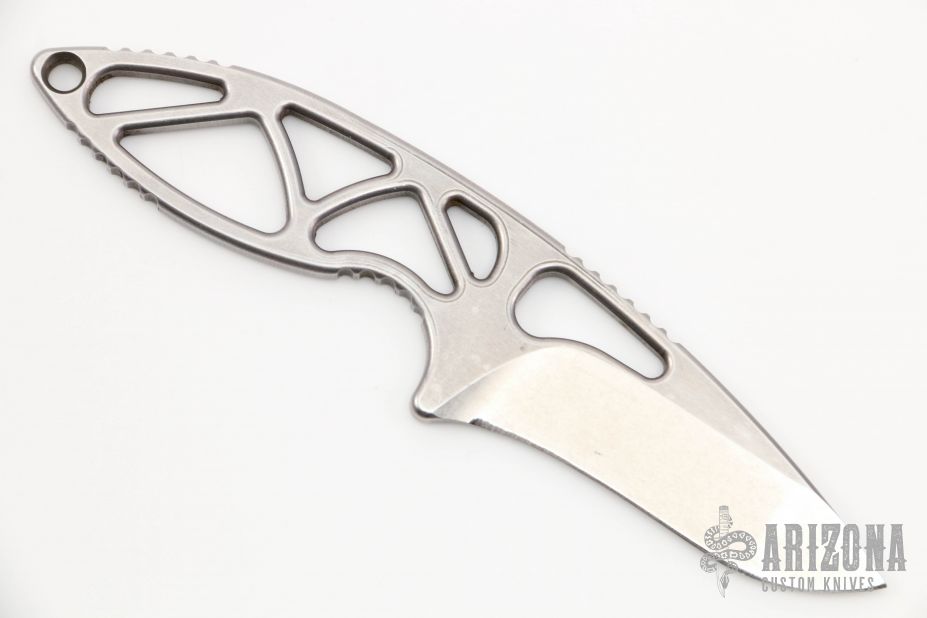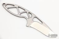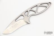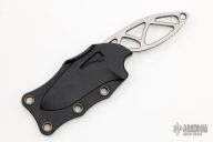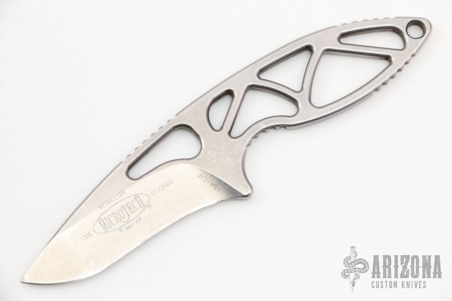 This Medallion neck knife has a stonewashed blade with notched thumbrest, .161" blade stock and 1.40" blade depth, full skeletonized tang construction. Dated 01/2002 and s/n 1326. Includes original sheath. Has a few light scuffs, otherwise excellent condition.
