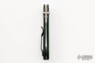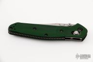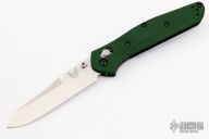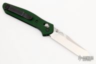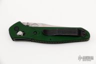 This Benchmade Osborne 940 features a tumble finished clip point blade with swedge and dual thumb studs. The handle is comprised of a machined and green anodized aluminum frame over jimped and purple anodized titanium backspacer. The black coated, steel tip up clip is reversible for right or left hand carry. Comes with soft pouch. Has a light scratch, otherwise excellent condition.