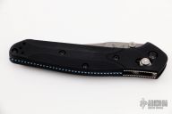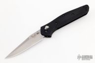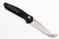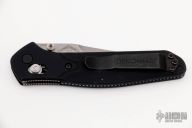 This Osborne designed Benchmade features a stonewashed plain edge blade, black aluminum handle, tip up reversible stainless steel clip. Axis lock mechanism. Comes with a soft pouch. Has a couple light scuffs, otherwise excellent condition.