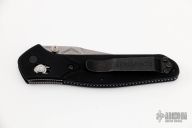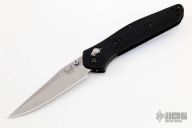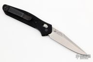 This Osborne designed Benchmade features a stonewashed plain edge blade, black aluminum handle, tip up reversible stainless steel clip. Axis lock mechanism. Comes with a soft pouch. Has a couple light scuffs, otherwise excellent condition.