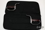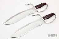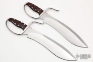 This pair of Sasquatch Style Wing Chun butterfly knives have been crafted by Forge Master K Ali. These knives are made of power hammered 9260 spring steel pounded down to 5/16". The Sasquatch style blade is adapted from Doug Kenefick's design of the Randall Sasquatch and was blessed by Doug. The D-quard is molded AISI 304 stainless. Handle scales are an unusual glossy paper phenolic with a subtle wood grain pattern with 8 pins to the tang. They comes with a zippered case that holds both knives. Both knives have some rust developing around the ricasso area, otherwise good condition.
