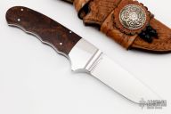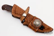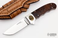 This Integral Hunter by Schrade is a D'Alton Holder design, it features a mirror polished blade with .200" blade stock and 1.179" blade depth, integral full tapered tang construction. The handle has integral dovetailed bolsters with inlaid bear engraving, desert ironwood burl scales with stainless steel pins. Comes with a hand tooled brown leather sheath that is actually for a custom D'Alton Holder knife, it fits perfectly. Excellent condition. #456
