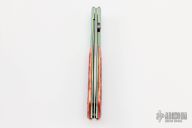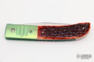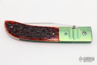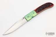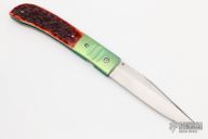 This linerlock folder by Charles H Morris is a Mel Pardue design, it features a hand rub satin finished clip point blade with a false top edge and single thumbstud. The handle has dovetailed and tumble finished stainless steel bolsters, stag scales, satin finished stainless steel liners and backspacer. Has nice lockup and blade seating. Excellent condition.