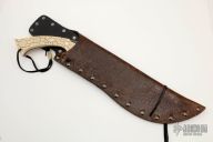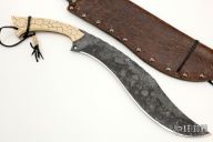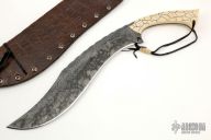 This Bokri by Sage Blades features a black and silver KG-Gunkote (marble/Damascus pattern) blade with fileworked spine, .188" blade stock and 2.555" blade depth, full tang construction. The handle has ivory paper micarta scales, textured and patterned, with nickel silver pins and a black lanyard with ivory micarta bead. Comes with a brown leather sheath with crocodile patterned overlay. Excellent condition.