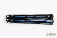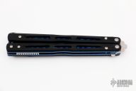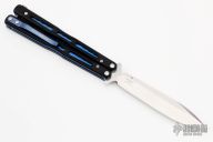 This Model 51 Morpho Balisong from Benchmade has a stonewash finished D2 stainless steel spear point blade. Handle is black G10 with blue jeweled/ anodized titanium liners and blue anodized titanium tip up clip. Excellent condition. Comes with original box and papers.