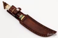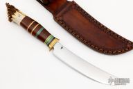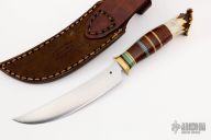 This Scagel Style Hunter by Jeremy Ray Turner features a satin finished convex ground blade with .201" blade stock and 1.075" blade depth, hidden tang construction. The handle has a brass guard, crown stag butt, and a stacked leather grip with yellow/aluminum/green spacers. Comes with a hand tooled brown leather sheath. Excellent condition.