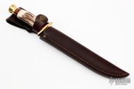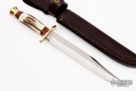 This Toothpick by Linder features satin finished clip point blade with a false top edge, .143" blade stock and 1.123" blade depth, hidden tang construction. The handle features a brass guard and butt with a stag grip. Includes original leather sheath. Excellent Condition.