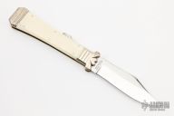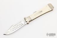 Parker Company revived many vintage designs with a modern look and this one is fashioned after the Civil War era "Coffin" shaped handle. This knife is BIG, 10.75 inches in overall length with a 4.75 inch blade. Emblazoned "Ourselves we must defend" Blade is Japanese made surgical steel, handle is thick bone with brass liners and nickle silver bolsters. Serial #679. Excellent condition. Comes with original box.
