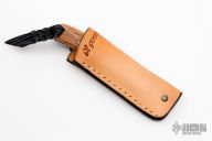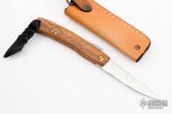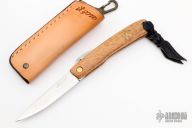 This Higonokami by Kei Goto features a VG-10 San Mai Damascus blade. The handle is one piece of Hawaiian Koa with brass and nickel silver pins, lanyard hole. Comes with a leather slip sheath. Excellent condition.