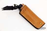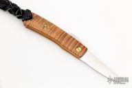 This Higonokami by Kei Goto features a VG-10 San Mai Damascus blade. The handle is one piece of Hawaiian Koa with brass and nickel silver pins, lanyard hole. Comes with a leather slip sheath. Excellent condition.
