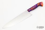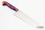 This Chef's Knife by Matt Sicard features a hand rub satin finished blade with .119" blade stock and 1.943" blade depth at the heel, full tang construction. The handle has orange/purple resin scales. New from maker.